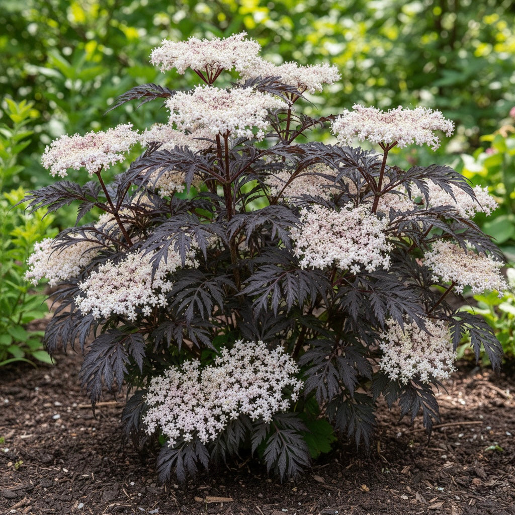Black Lace Elderberry (Sambucus nigra) is a striking ornamental and medicinal shrub prized for its deeply cut, dark purple to nearly black foliage that resembles lace. In late spring to early summer, it produces large, flat clusters of soft pink, lemon-scented flowers that contrast beautifully against the dark leaves. These blooms are followed by deep purple-black berries when properly pollinated. Black Lace Elderberry is commonly used in edible landscapes, medicinal gardens, and as a dramatic focal plant. Beyond its beauty, it shares the same traditional herbal uses as common elderberry, valued for immune-supporting flowers and berries.