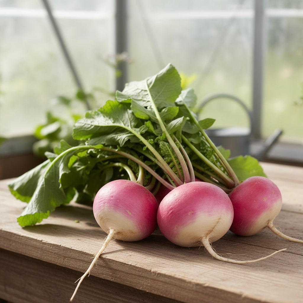 Turnip ‘Hidabeni’ is a Japanese heirloom variety prized for its small, round, bright red roots with tender white flesh. Known for its mild, sweet flavor, it is excellent for fresh salads, pickling, or lightly cooked dishes. The roots are crisp and juicy, while the tops are edible as greens with a slightly peppery taste. ‘Hidabeni’ matures quickly and performs well in both spring and fall plantings. Non-GMO and organically grown, this variety is ideal for gardeners seeking flavorful, fast-growing turnips with both root and leafy use.