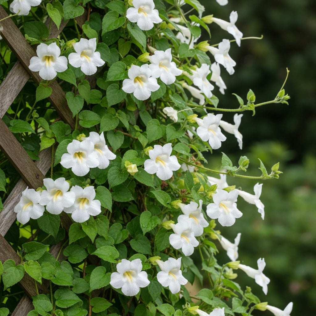 White Asarina, commonly known as Climbing Snapdragon, is a fast-growing ornamental vine producing elegant, pure white, trumpet-shaped flowers with a soft fragrance. The blooms resemble miniature snapdragons and appear continuously throughout the growing season. Its heart-shaped green foliage creates a lush backdrop, making it ideal for trellises, fences, arbors, hanging baskets, and containers.