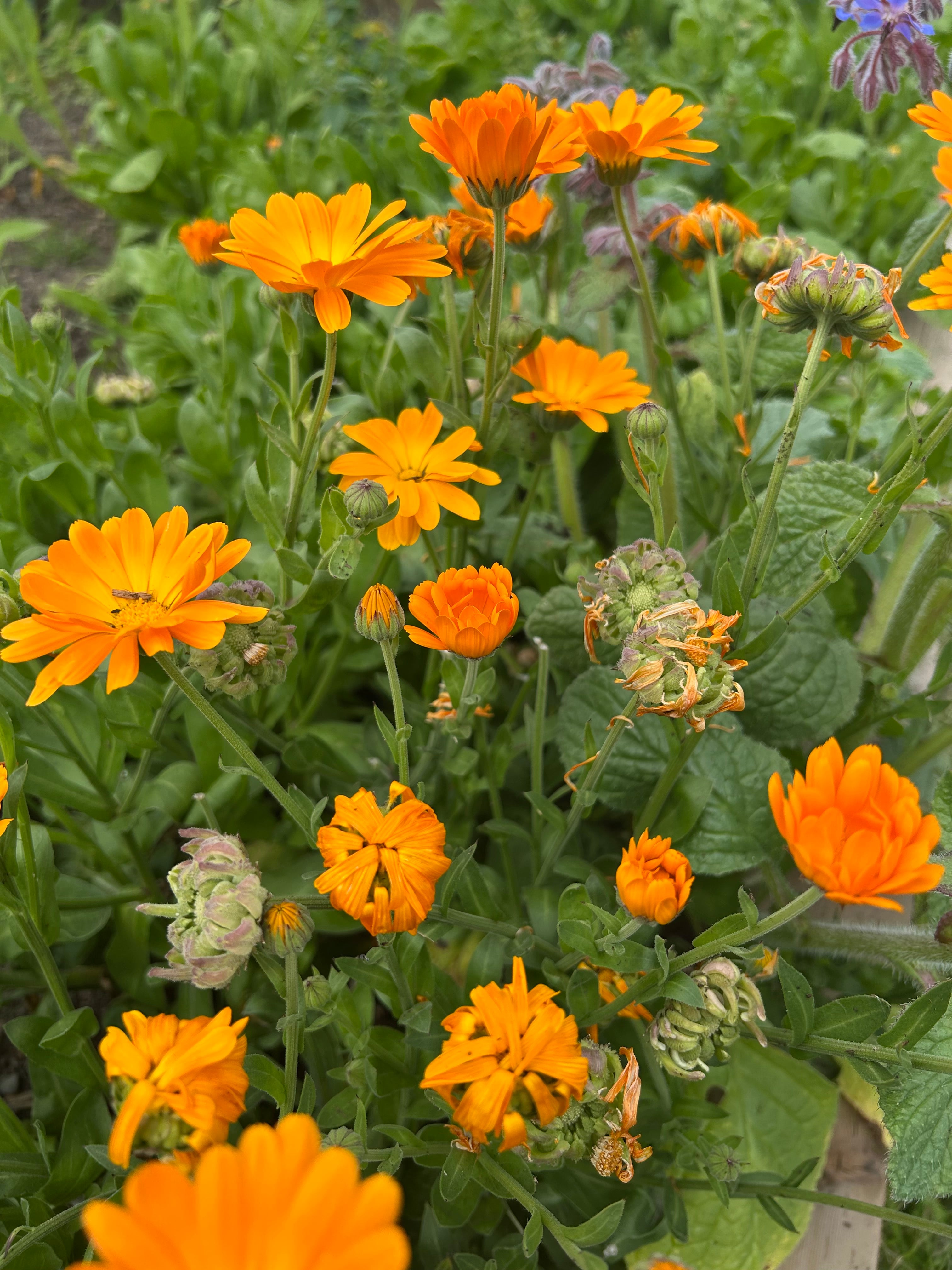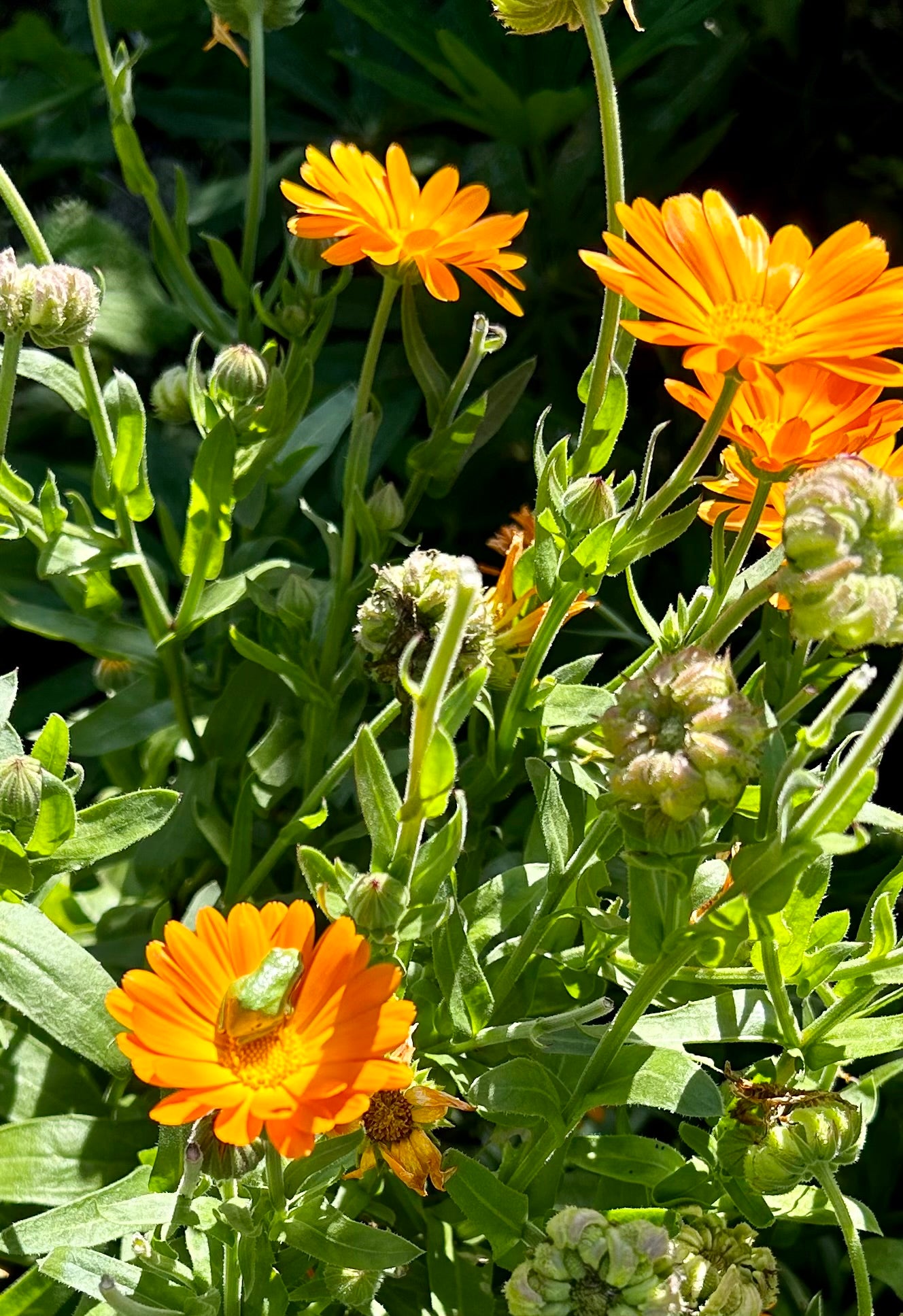 Gorgeous intense orange color and always a cheery flower to brighten up the garden all season long. Calendulas are also known as pot marigold, common marigold, ruddles or scotch marigold and is a member of the daisy family Asteraceae. This flower is a huge producer of seeds. You will never have to buy Calendula seeds again if you harvest your own.